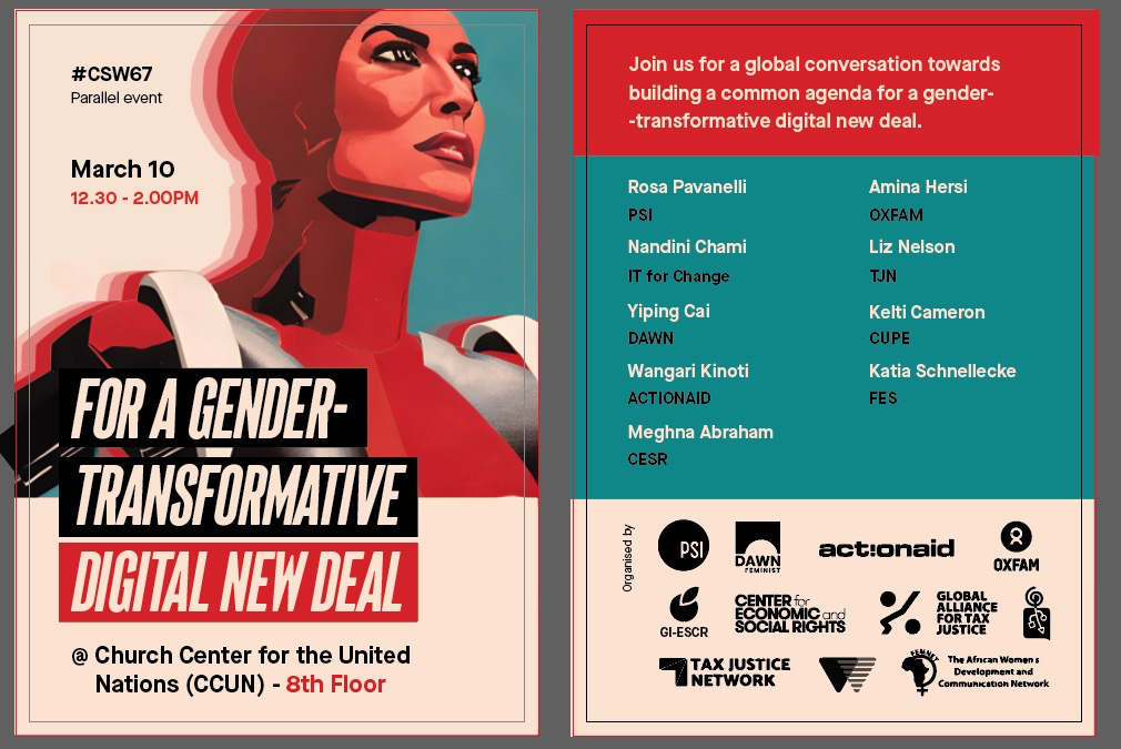En este contexto, GI-ESCR ha co-patrocinó un acto paralelo en el 67º período de sesiones de La Comisión de la Condición Jurídica y Social de la Mujer, sobre un nuevo programa común para un nuevo pacto digital transformador en materia de género, con PSI, DAWN, ActionAid, OXFAM, CESR, GI-ESCR, GATJ, TJN, Womankind, FEMNET e IT for Change.